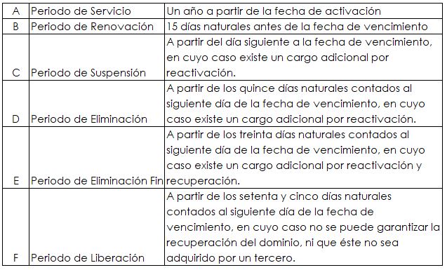 Periodos de Servicio, Renovación, Reactivación, Recuperación y Eliminación de Dominios