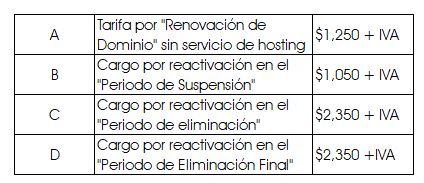 C) Durante el “Periodo de Eliminación” el cliente podrá solicitar la transferencia del dominio en cuyo caso deberá cubrir la “Tarifa de renovación” más una cuota de penalización por reactivación del dominio (ver tabla de costos).